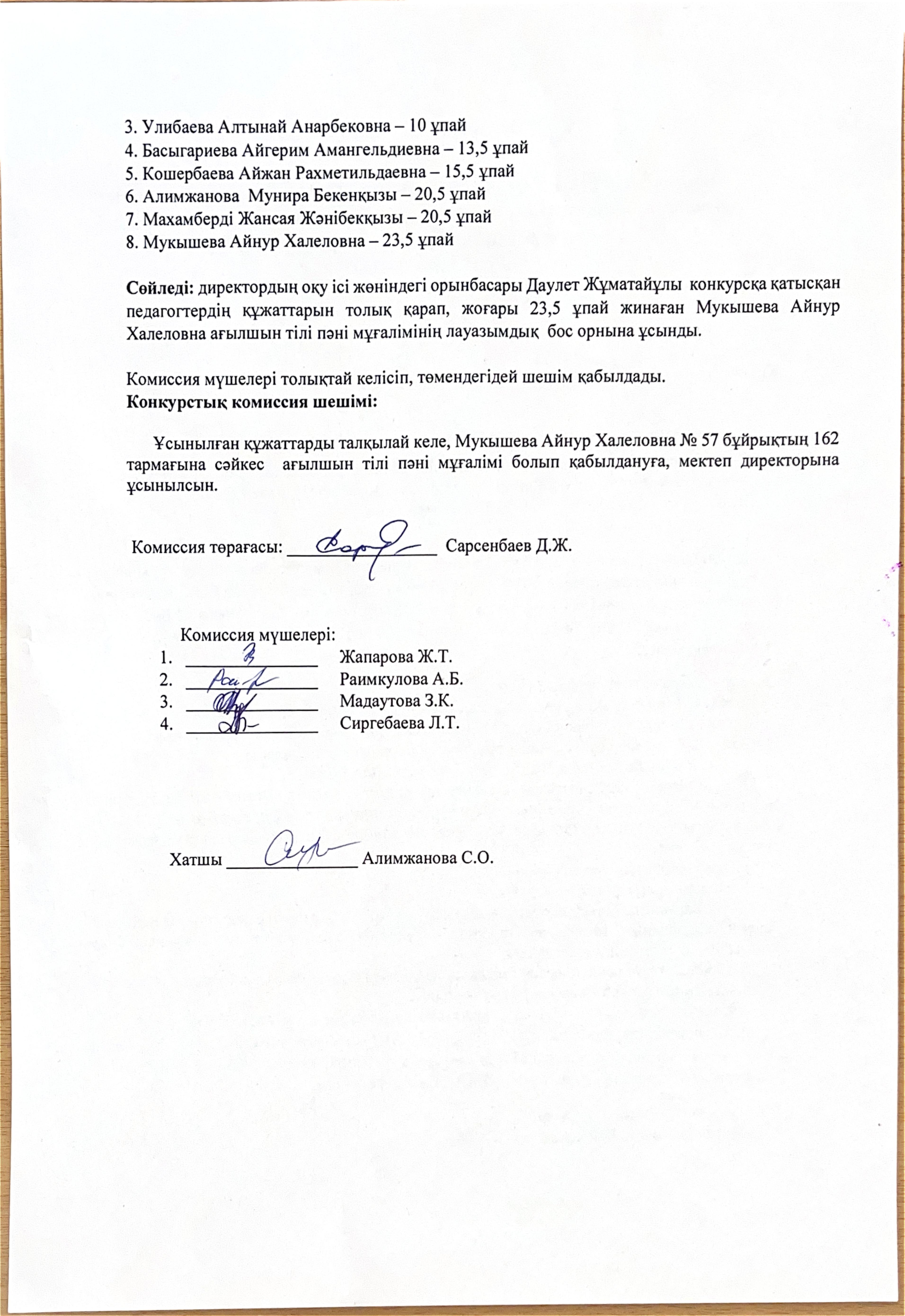 104 мектеп » Ақпарат » Мемлекеттік білім беру ұйымдарының бірінші басшылары мен педагогтерін лауазымға тағайындау,лауазымға тағайындау,лауазымнан босату туралы конкурстық комиссия отырысының №1 хаттамасы