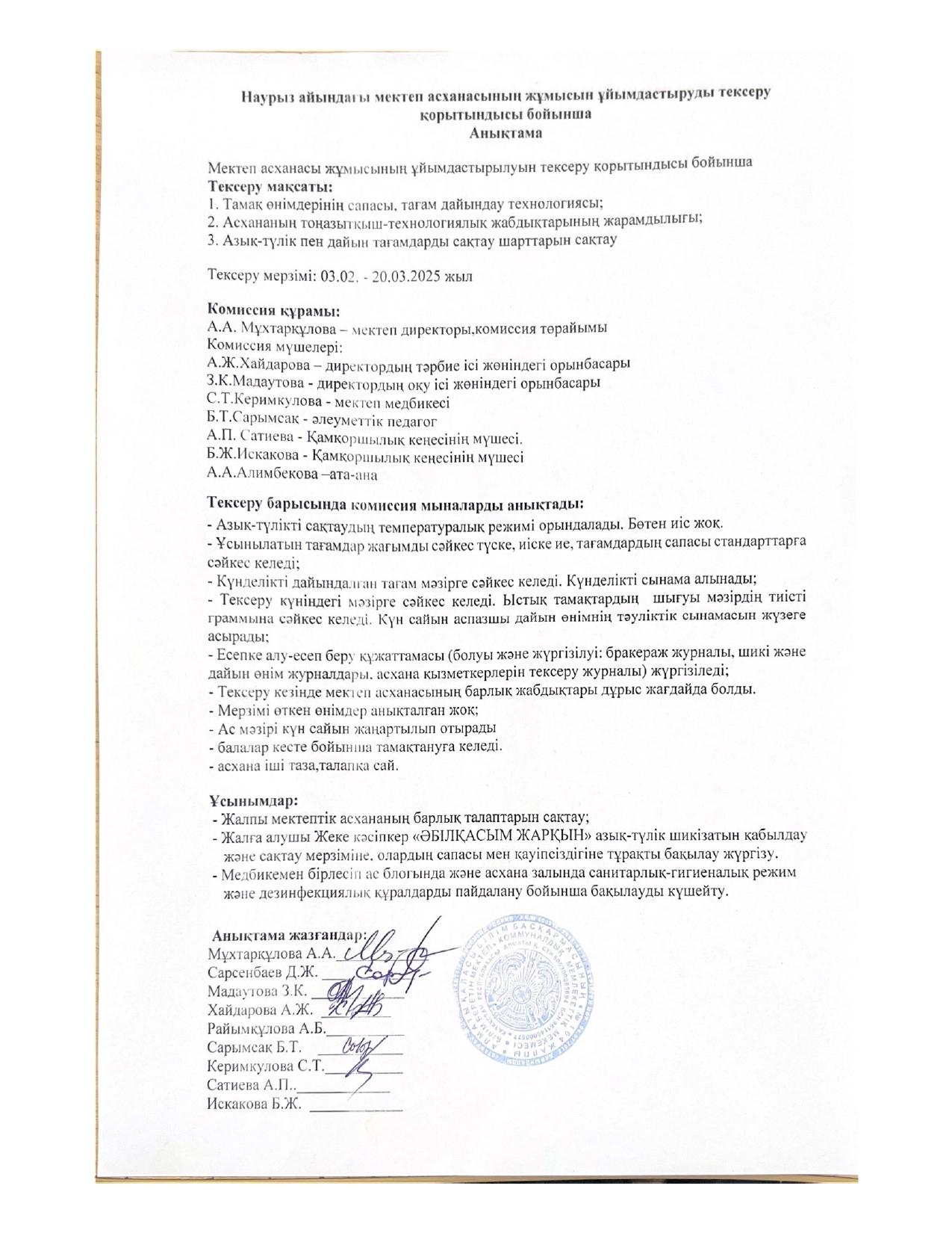 Бракераж комиссиясының наурыз айындағы мектеп асханасының жұмысын ұйымдастыруды тексеру қорытындысы бойынша жасаған анықтамасы