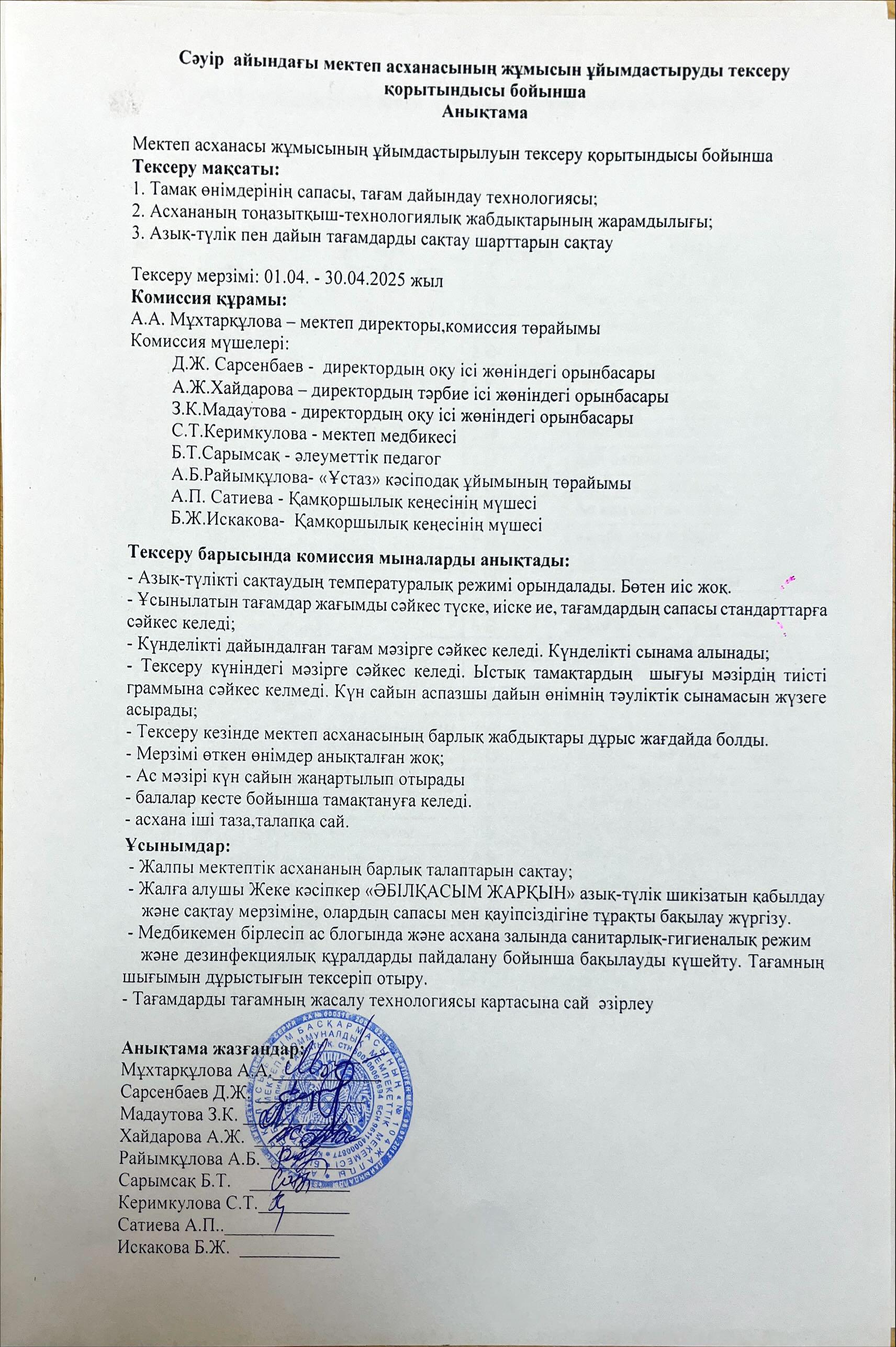 30 апрель 2025 0 1 2 3 4 5 Бракераж комиссиясының сәуір айындағы мектеп асханасының жұмысын ұйымдастыруды тексеру қорытындысы бойынша жасаған анықтамасы